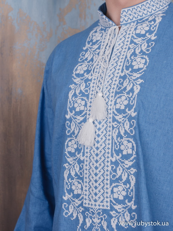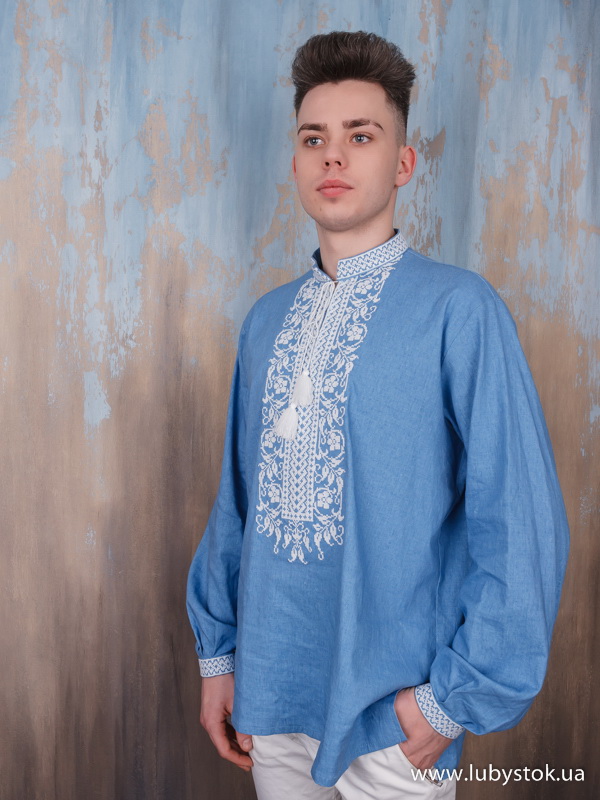 Вишита сорочка чоловіча - вишиванка хрестиком С 54-2 на блакитному льоні. Вишита білими акриловими нитками. Стиль традиційно-сучасний.