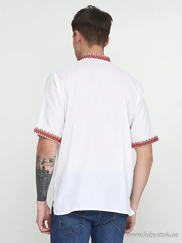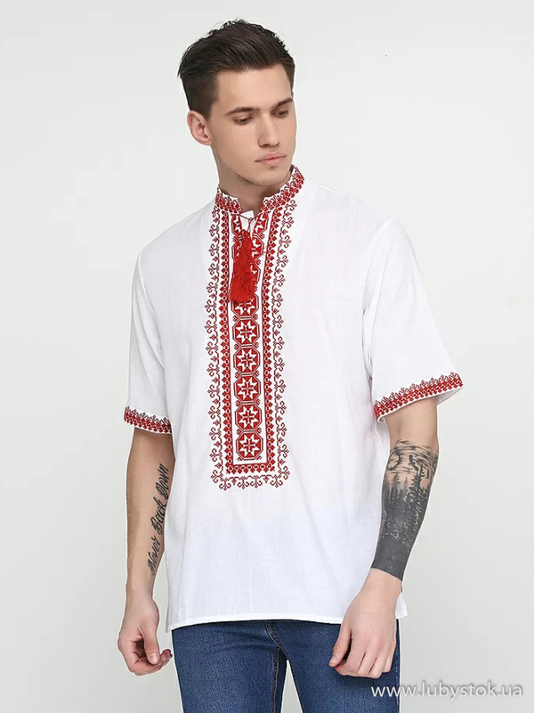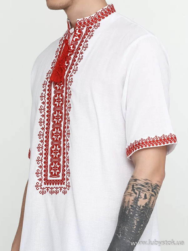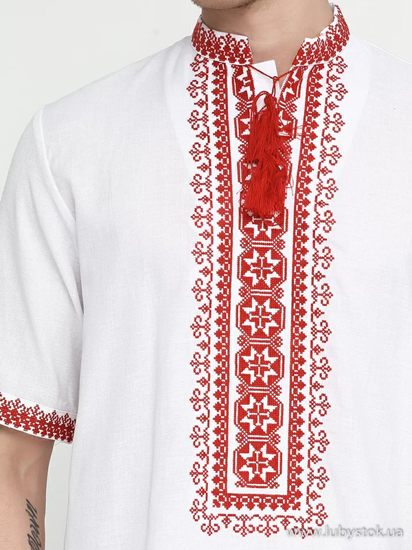 Вишита сорочка чоловіча - вишиванка хрестиком С 57-1. Завдяки візерунку та фасону має особливий вигляд. Традиційний український крій сорочки з білої домотканої тканини або натурального льону. Вишиванка виконана хрестиком червоними акриловими нитками, геометричним візерунком. На довгий рукав з коміром-стійкою. Вишивка на грудях, манжетак та комірі-стійці. Чудово підійде як для святкових так і для днів коли хочеться мати особливий вигляд.