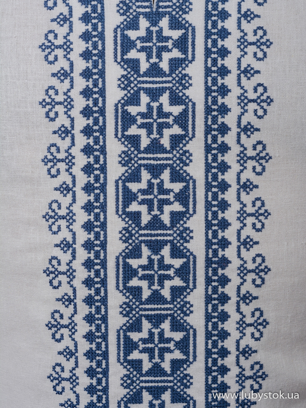 Вишита сорочка чоловіча - вишиванка хрестиком С 57-2. Завдяки візерунку та фасону має особливий вигляд. Традиційний український крій сорочки з білої тканини натурального льону. Вишиванка виконана хрестиком синіми акриловими нитками, геометричним візерунком. На довгий рукав з коміром-стійкою. Вишивка на грудях, манжетак та комірі-стійці. Чудово підійде як для святкових так і для днів коли хочеться мати особливий вигляд.