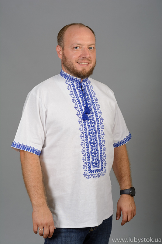 Вишита сорочка чоловіча - вишиванка хрестиком С 57-3. Завдяки візерунку та фасону має особливий вигляд. Традиційний український крій сорочки з білої домотканої тканини або натурального льону. Вишиванка виконана хрестиком синіми акриловими нитками, геометричним візерунком. На довгий рукав з коміром-стійкою. Вишивка на грудях, манжетак та комірі-стійці. Чудово підійде як для святкових так і для днів коли хочеться мати особливий вигляд.