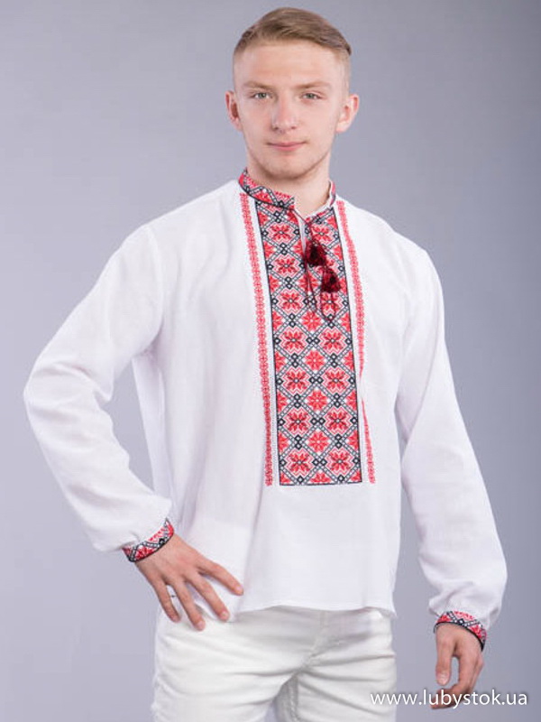 Вишита сорочка чоловіча - вишиванка хрестиком С 60-1 на домотканному полотні. Візерунок-оберіг червоними та чорними акриловими нитками. Традиційний український крій сорочки на довгий рукав з коміром-стійкою. Вишивка на грудях, кінцях рукавів, комірі-стійці.