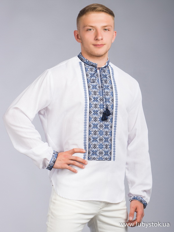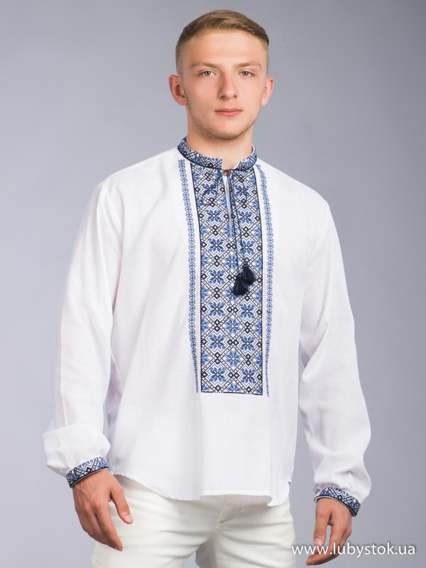 Вишита сорочка чоловіча - вишиванка хрестиком С 60-3 на домотканному полотні. Візерунок-оберіг синіми акриловими нитками. Традиційний український крій сорочки на довгий рукав з коміром-стійкою. Вишивка на грудях, кінцях рукавів, комірі-стійці.