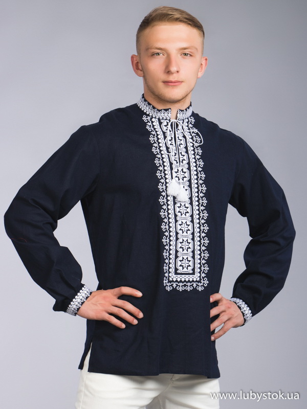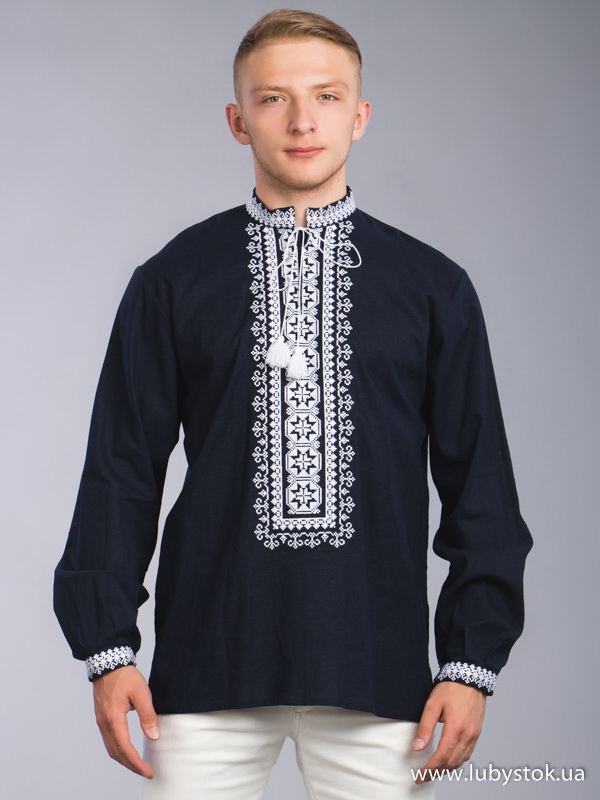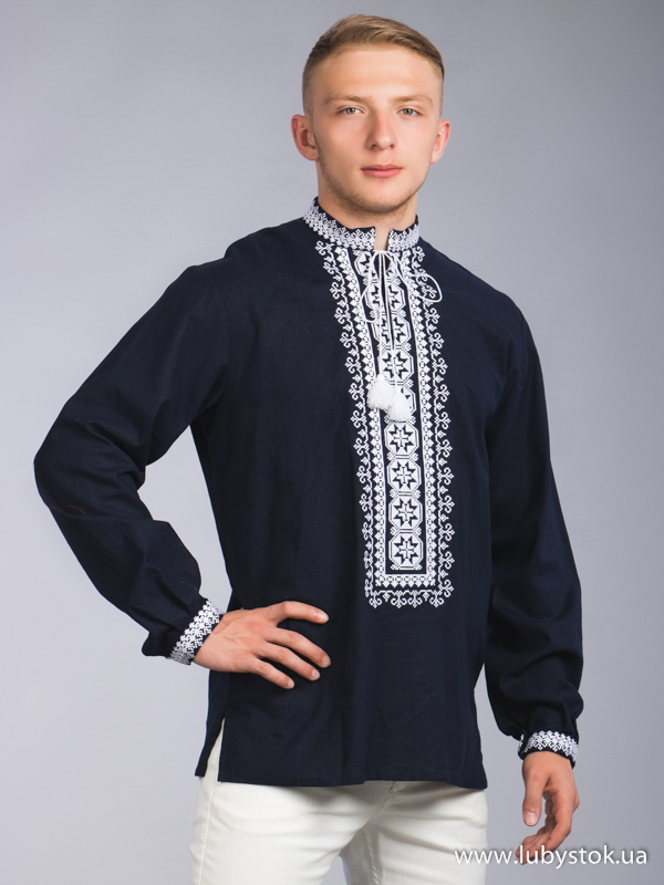 Вишита сорочка чоловіча - вишиванка хрестиком С 61-1. Завдяки фасону та кольру має оригінальний вигляд. Сучасний стиль сорочки з темно синього натурального льону. Вишиванка виконана хрестиком, геометрично-рослинним візерунком білими акриловими нитками. На довгий рукав з коміром-стійкою. Вишивка на грудях, манжетак та комірі. Ця сорочка чудово підійде для урочистих подій та святкових днів.