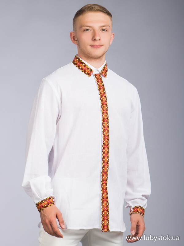 Вишиванка хрестиком - вишита сорочка чоловіча С 64-1. Вишиванка у сучасному стилі з відкладним коміром. Вишивка вздовж лінії гудзиків, на комірі та манжетах. Вишита помаранчевими, жовтими, червоними та чорними акриловими нитками на домотканому полотні.