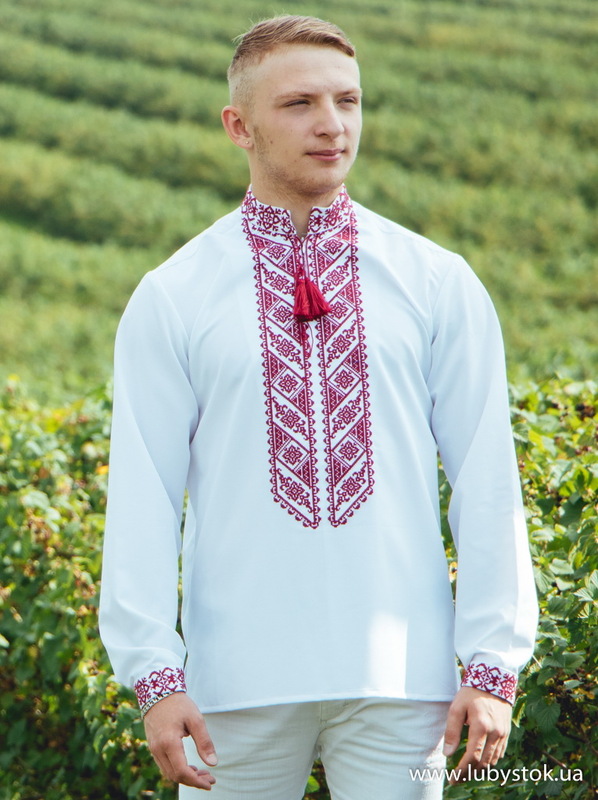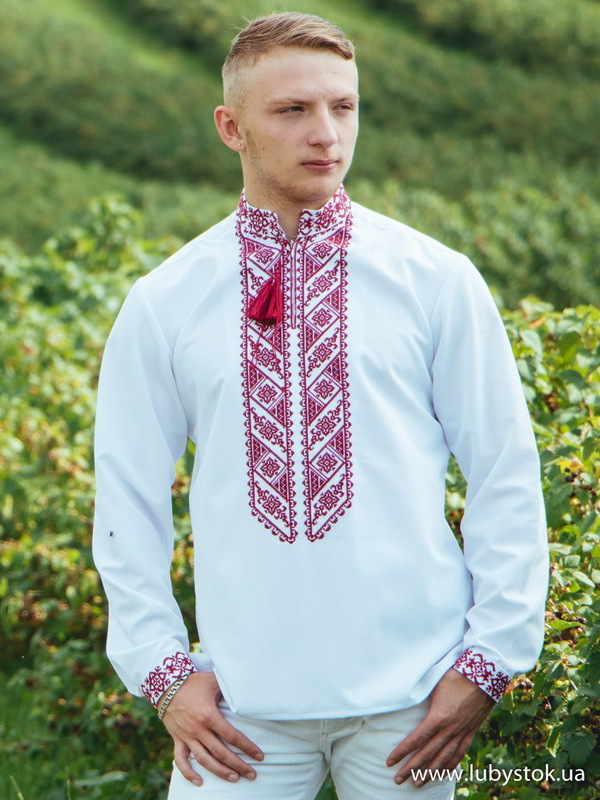 Вишиванка хрестиком - вишита сорочка чоловіча С 66-2. Візерунок-оберіг червоними візкозними або акриловими нитками. Традиційний український крій сорочки на довгий рукав з коміром-стійкою. Вишивка на грудях, кінцях рукавів, комірі-стійці. Тканина - тіар.