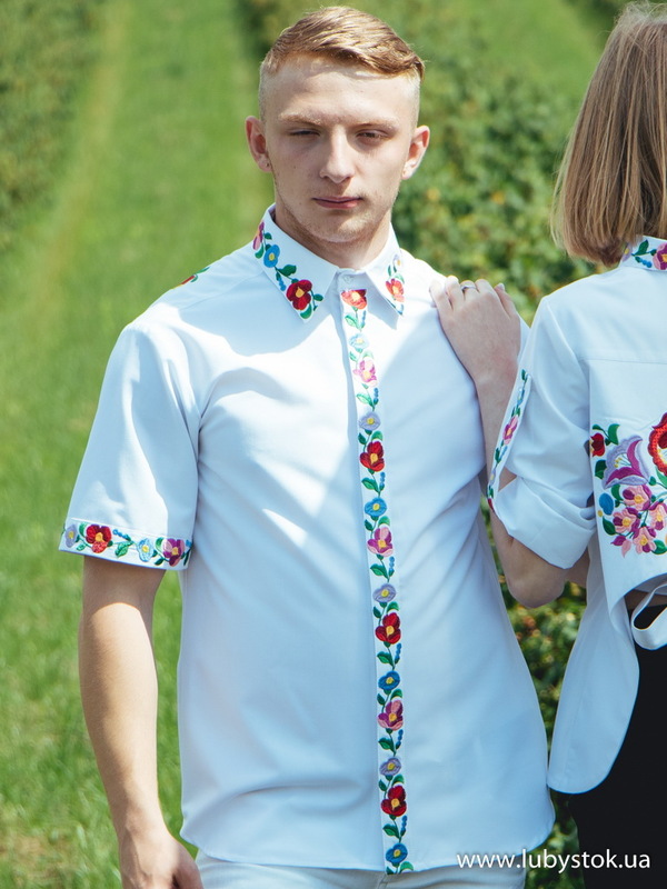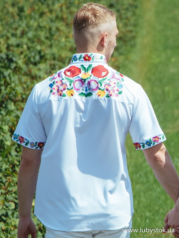 Вишиванка гладдю - вишита чоловіча сорочка з рослинним орнаментом ЧСВ 72-1. Завдяки оригінальному візерунку та крою має особливий вигляд. Сучасний український стиль сорочки з білої віскозної тканини. Вишиванка виконана гладдю кольоровими акриловими нитками, рослинним візерунком з квітами та листочками. Вишивка по лінії гудзиків, спині, манжетах та комірі. Чудово підійде для урочистих та святкових події.
