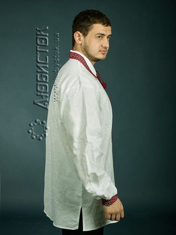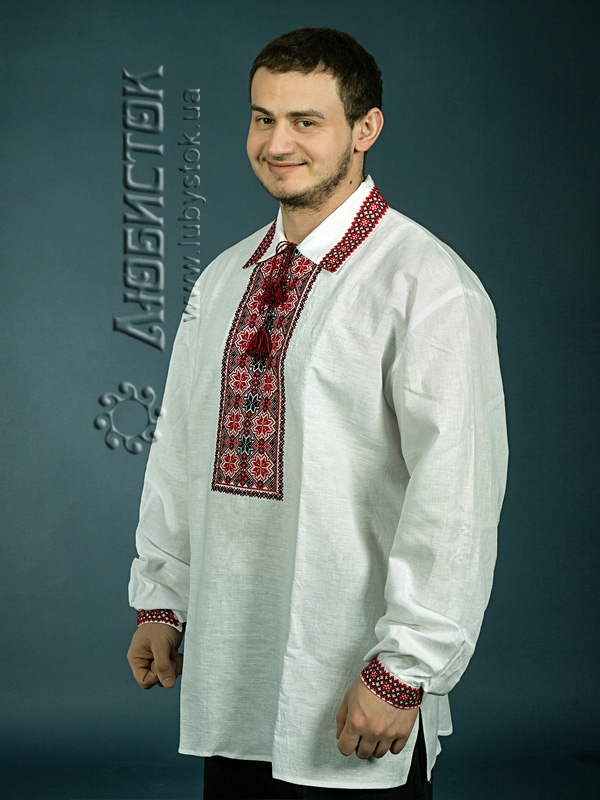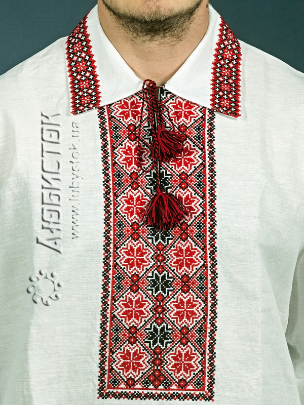 Вишиванка - вишита хрестиком чоловіча сорочка на льоні ЧСВ 9-1L. Крій - сучасний. Комір - відкладний. Горловина на петлях зі шнурком та кутасиками. Краї рукавів з вишивкою на манжеті і ґудзик. Вишивка хрестиком, червоними та чорними акриловими нитками. Тканина 100% льон.