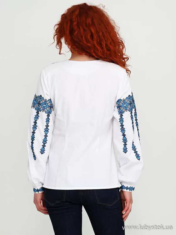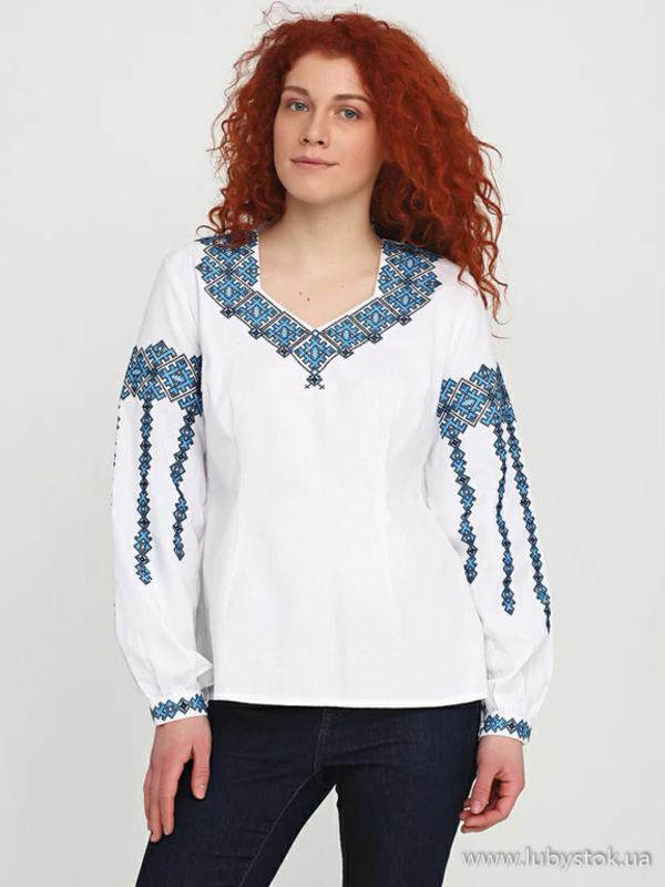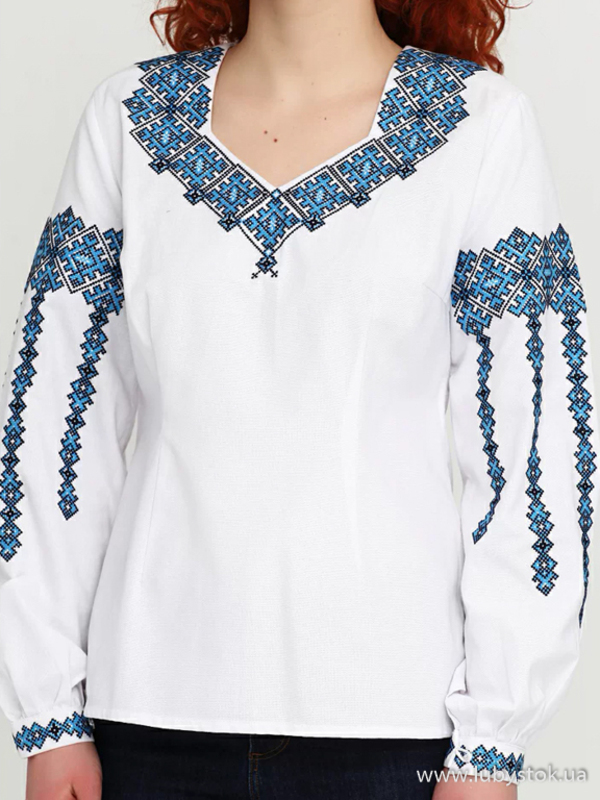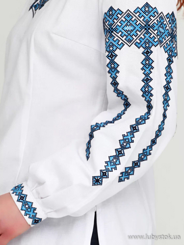 Вишита блуза хрестиком (вишита жіноча сорочка) ЖБВ 2-4. Завдяки орнаменту та кольорам має оригінальний вигляд. Стиль сучасний з традиційними мотивами на білій домотканій тканині або натуральному льоні. Вишиванка вишита хрестиком синіми, блакитними та темно сірими акриловими нитками, виконана геометричним візирунком. Розміщена на грудях, рукавах та манжетах блузки. Рукав довгий. Підходить як для святкових так і для днів коли хочеться виглядати по особливому, неодмінно надасть вам неперевершеного вигляду.