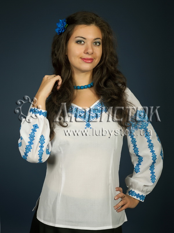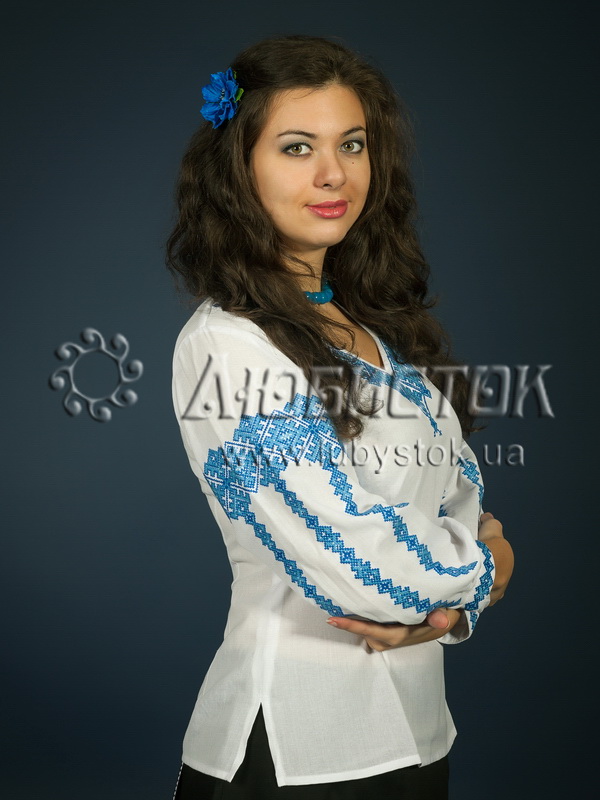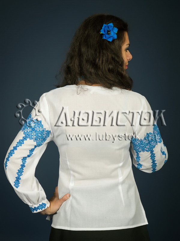 Вишита блуза хрестиком (вишита жіноча сорочка) ЖБВ 2-5. Завдяки візирунку та кольорам має легкий вигляд. Стиль сучасний з традиційними мотивами на білій домотканій тканині або натуральному льоні. Вишиванка вишита хрестиком блакитними та синіми акриловими нитками, виконана геометричним візирунком. Розміщена на грудях, рукавах та манжетах блузки. Рукав довгий. Підходить як для святкових так і для днів коли хочеться виглядати по особливому, неодмінно надасть вам неперевершеного вигляду.