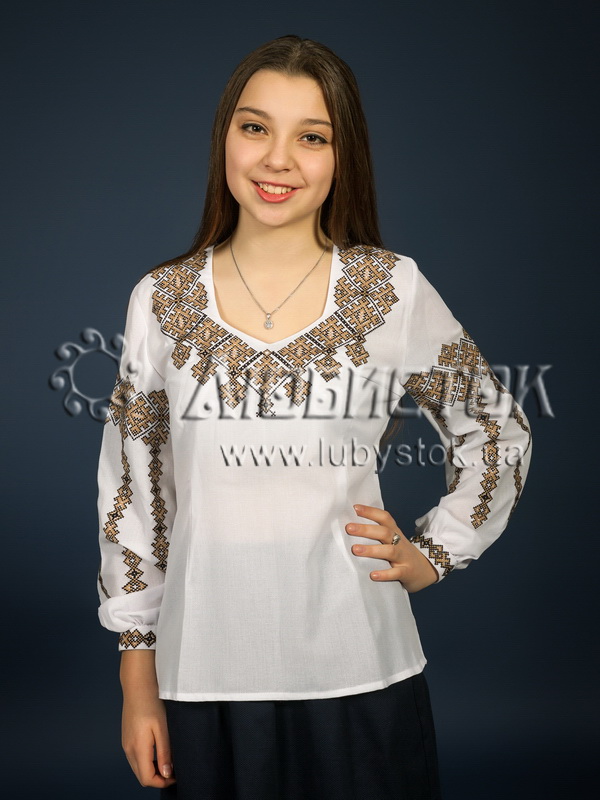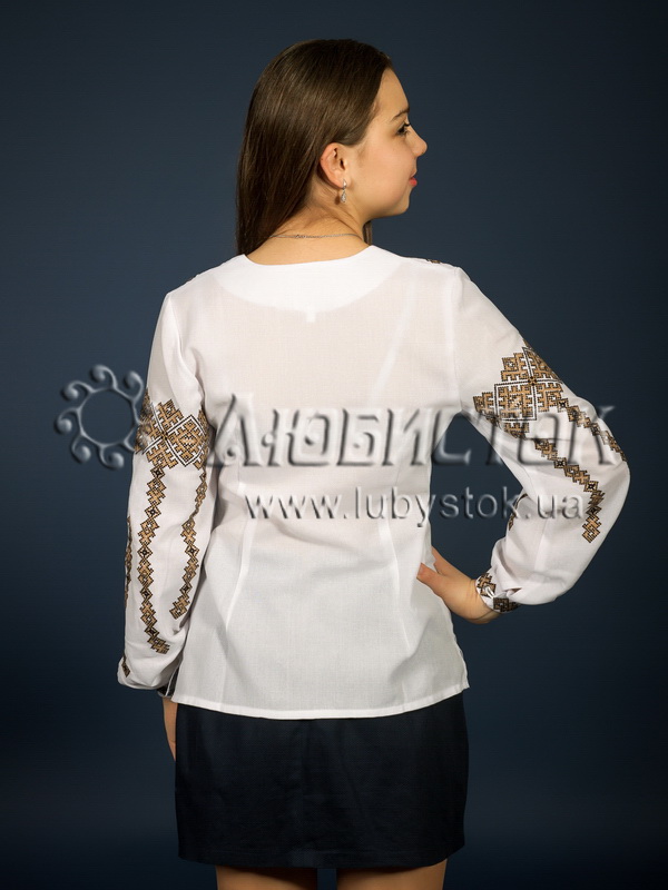 Вишита блуза хрестиком (вишита жіноча сорочка) ЖБВ 3-4. Ця блузка підходить для більш елегантних та зрілих жінок. Стиль сучасний з традиційними мотивами на білій домотканій тканині або натуральному льоні. Вишиванка вишита хрестиком коричневими, беживими та чорними акриловими нитками, виконана геометричним візирунком. Розміщена на грудях, рукавах та манжетах блузки. Рукав довгий. Підходить як для святкових так і для будніх днів, неодмінно надасть вам неперевершеного вигляду.