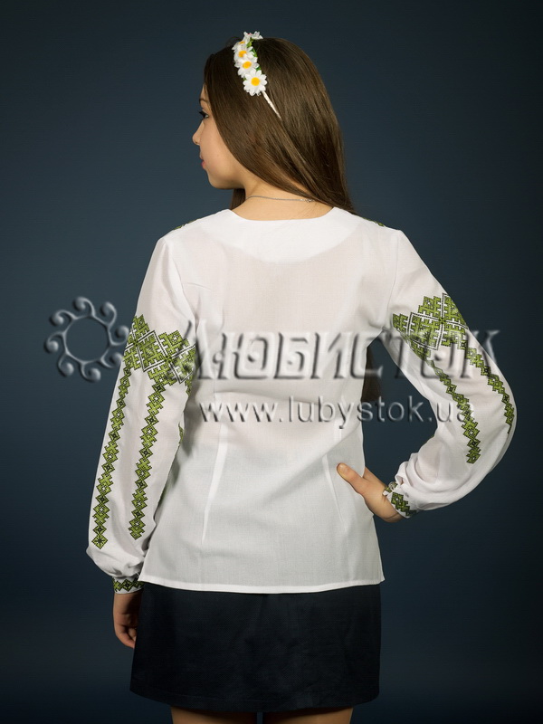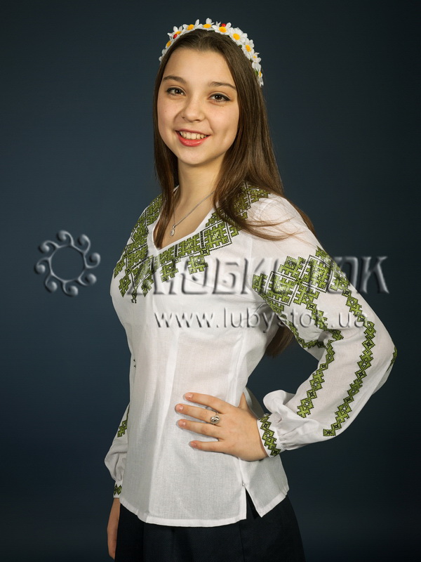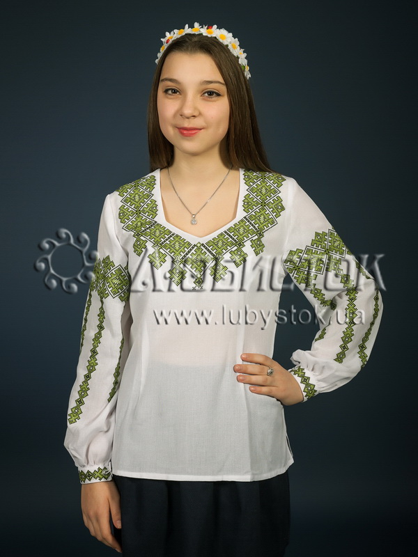 Вишита блуза хрестиком (вишита жіноча сорочка) ЖБВ 3-5. Ця блузка має елегантний та ніжний вигляд. Стиль сучасний з традиційними мотивами на білій домотканій тканині або натуральному льоні. Вишиванка вишита хрестиком зеленими та чорними акриловими нитками, виконана геометричним візирунком. Розміщена на грудях, рукавах та манжетах блузки. Рукав довгий. Підходить як для святкових так і для будніх днів, неодмінно надасть вам неперевершеного вигляду.