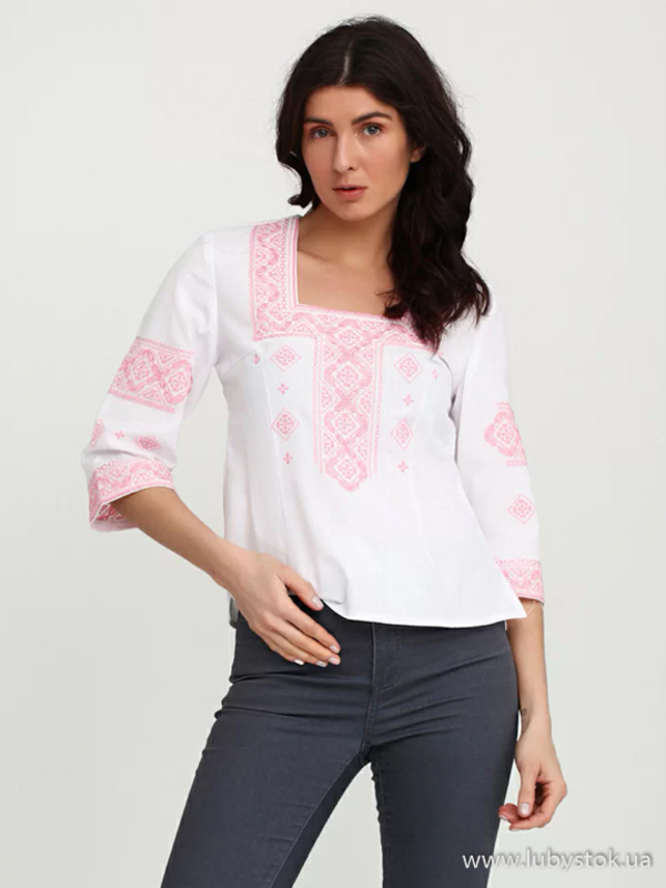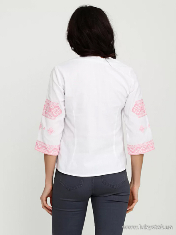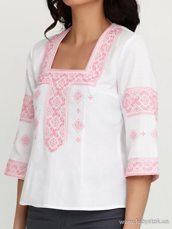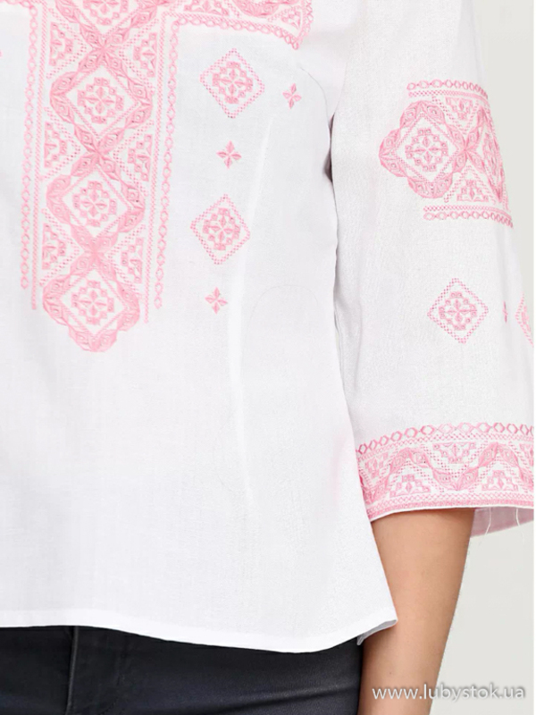 Жіноча вишиванка гладдю ЖБВ 4-5. Завдяки кольору та візерунку вигляд блузки легкий та дуже ніжний. Стиль сорочки сучасний на білій домотканій тканині або натуральному льоні. Вишиванка вишита гладдю темно рожевими та рожевими акриловими нитками. Вишивка виконана геометричним візерунком, розміщена на грудях, рукавах та манжетах блузки. Рукав три четверті, оригінальний виріз. Підходить для святкових подій, неодмінно надасть вам вишуканого вигляду.