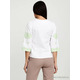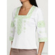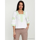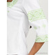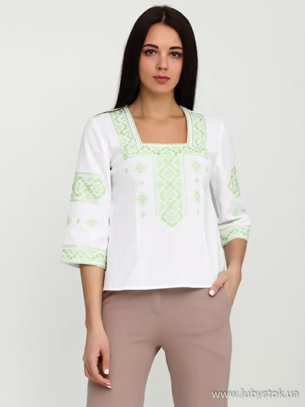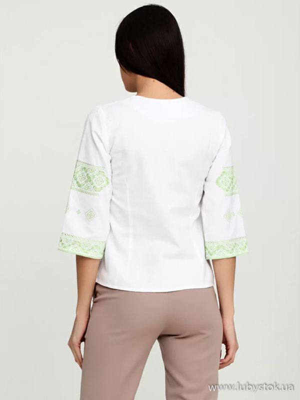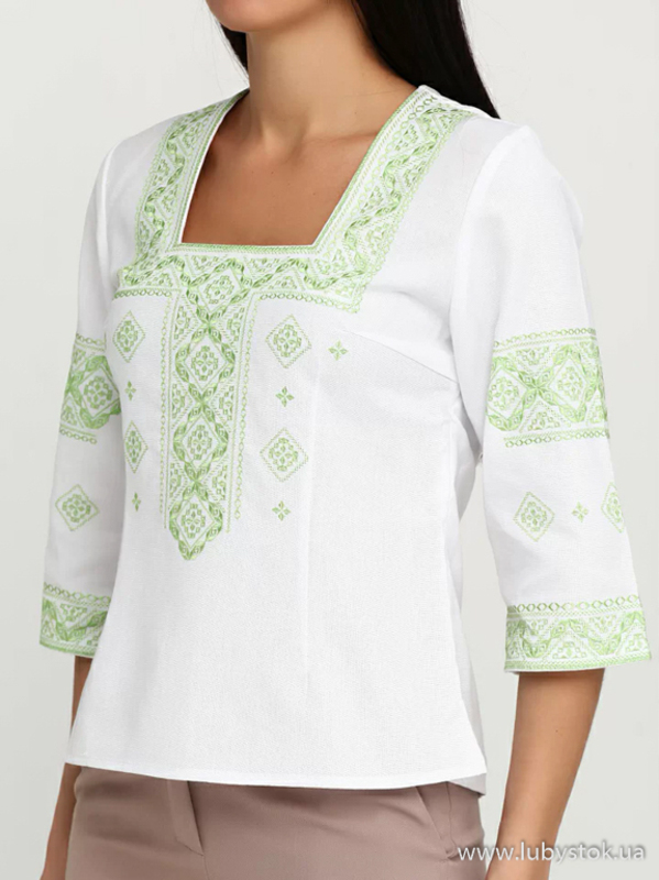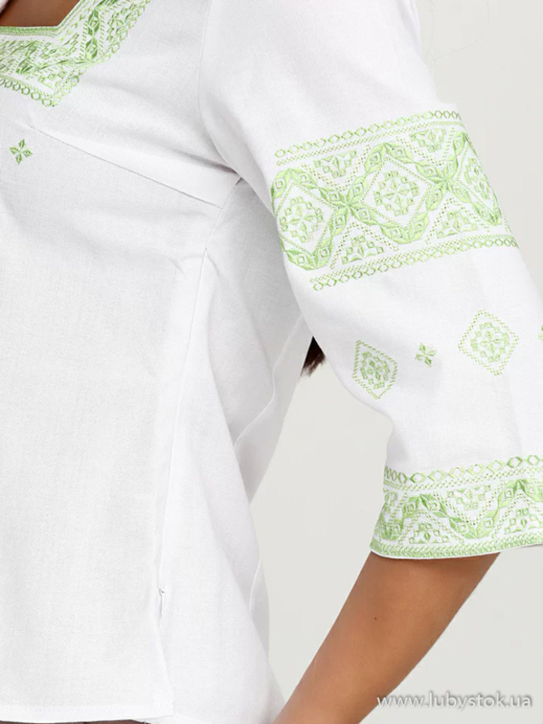 Вишита блуза гладдю (вишита жіноча сорочка) ЖБВ 4-6. Завдяки кольору та візерунку вигляд блузки легкий та дуже ніжний. Стиль сорочки сучасний на білій домотканій тканині або натуральному льоні. Вишиванка вишита гладдю зеленими шовковими нитками. Вишивка виконана геометричним візерунком, розміщена на грудях, рукавах та манжетах блузки. Рукав три четверті, оригінальний виріз. Підходить для святкових подій, неодмінно надасть вам вишуканого вигляду.