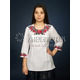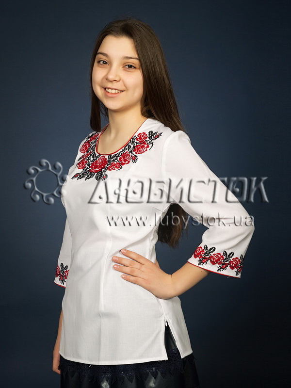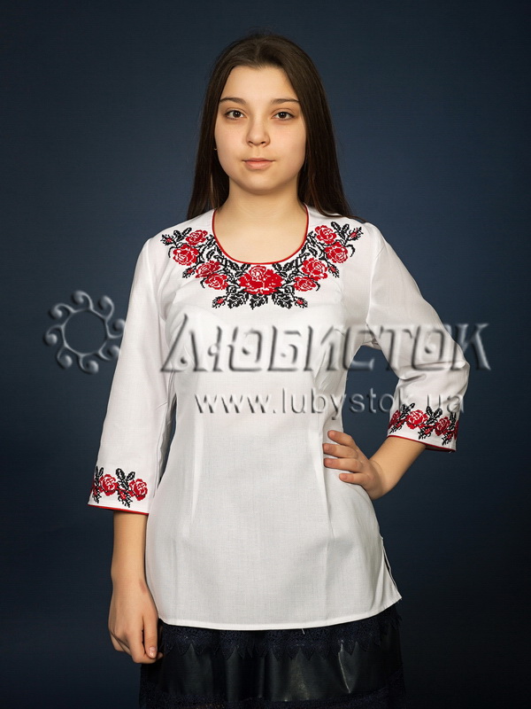 Вишита блуза хрестиком (вишита жіноча сорочка) ЖБВ 6-1. Ця блузка має елегантний вигляд, вишиті троянди надають їй оригінальності. Стиль сорочки сучасний з традиційними мотивами на білій домотканій тканині або натуральному льоні. Вишивка виконана рослинним візерунком у вигляді троянд з листочками, розміщена на грудях та рукавах блузки. Вишиванка вишита хрестиком червоними та чорними акриловими нитками. Рукав три четверті. Ця блузка підійде для святкування різноманітних свят, одягнувши її ваш настрій неоднмінно стане святковішим.