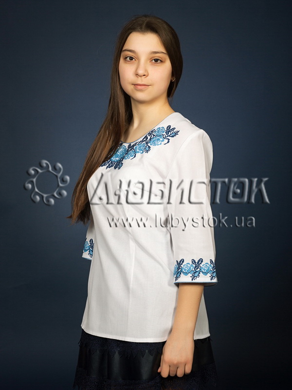 Вишита блуза хрестиком (вишита жіноча сорочка) ЖБВ 6-4. Ця блузка має елегантний вигляд, вишиті троянди надають їй оригінальності. Стиль сорочки сучасний з традиційними мотивами на білій домотканій тканині або натуральному льоні. Вишивка виконана рослинним візерунком у вигляді троянд з листочками, розміщена на грудях та рукавах блузки. Вишиванка вишита хрестиком блакитними та синіми акриловими нитками. Рукав три четверті. Ця блузка підійде для святкування різноманітних свят, одягнувши її ваш настрій неоднмінно стане святковішим.
