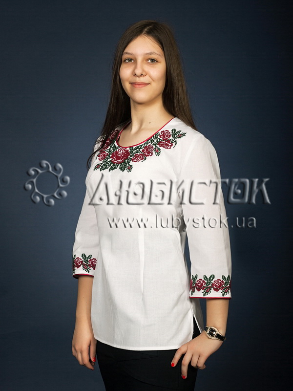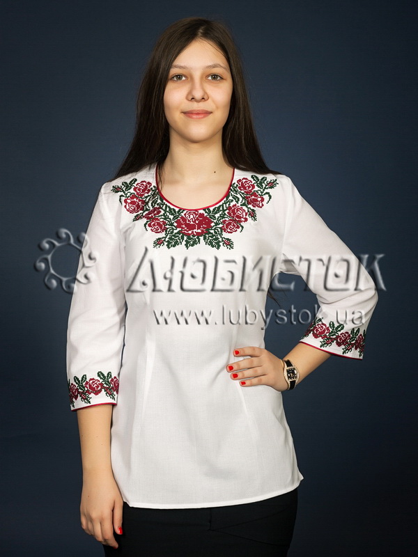 Вишита блуза хрестиком (вишита жіноча сорочка) ЖБВ 6-5. Ця блузка має елегантний вигляд, вишиті троянди надають їй оригінальності. Стиль сорочки сучасний з традиційними мотивами на білій домотканій тканині або натуральному льоні. Вишивка виконана рослинним візерунком у вигляді троянд з листочками, розміщена на грудях та рукавах блузки. Вишиванка вишита хрестиком червоними та зеленими акриловими нитками. Рукав три четверті. Ця блузка підійде для святкування різноманітних свят, одягнувши її ваш настрій неоднмінно стане святковішим.