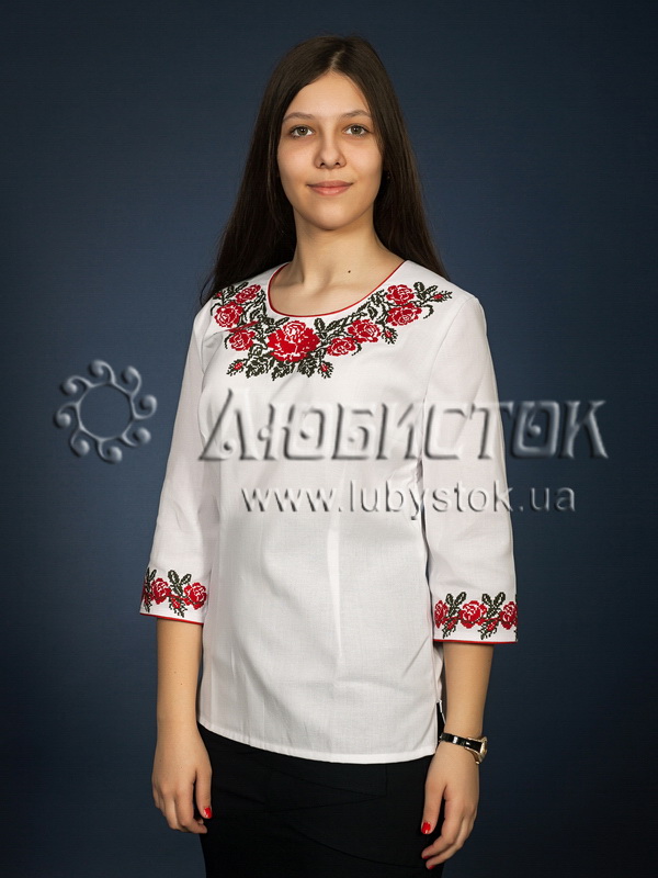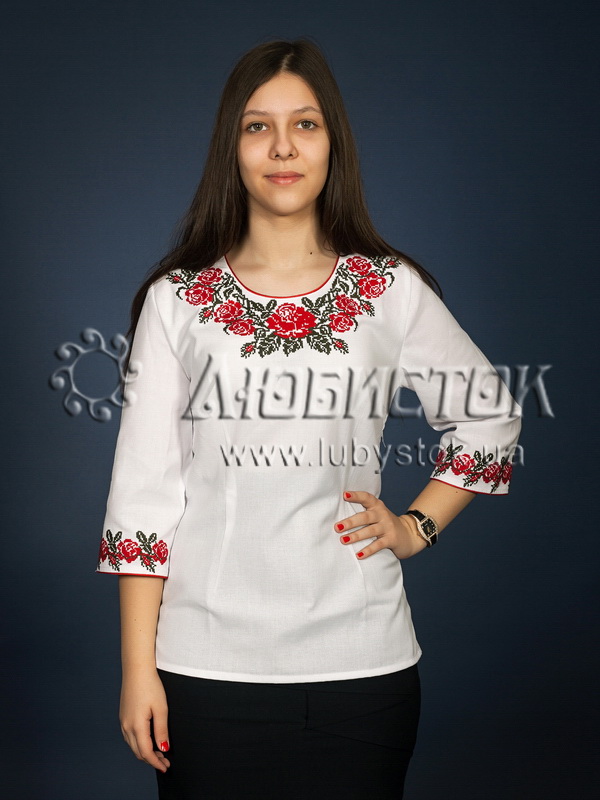 Вишита блуза хрестиком (вишита жіноча сорочка) ЖБВ 6-6. Ця блузка має елегантний вигляд, вишиті троянди надають їй оригінальності. Стиль сорочки сучасний з традиційними мотивами на білій домотканій тканині або натуральному льоні. Вишивка виконана рослинним візерунком у вигляді троянд з листочками, розміщена на грудях та рукавах блузки. Вишиванка вишита хрестиком червоними та темно зеленими акриловими нитками. Рукав три четверті. Ця блузка підійде для святкування різноманітних свят, одягнувши її ваш настрій неоднмінно стане святковішим.