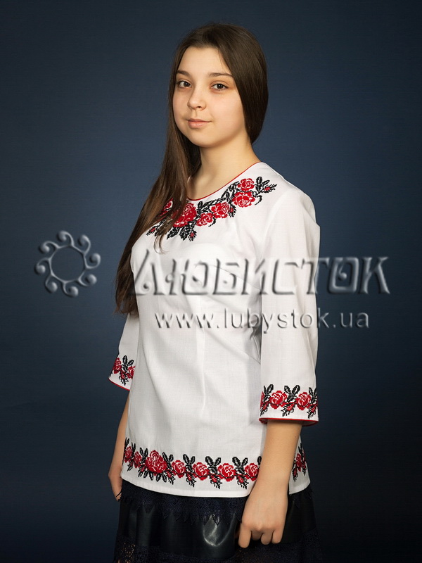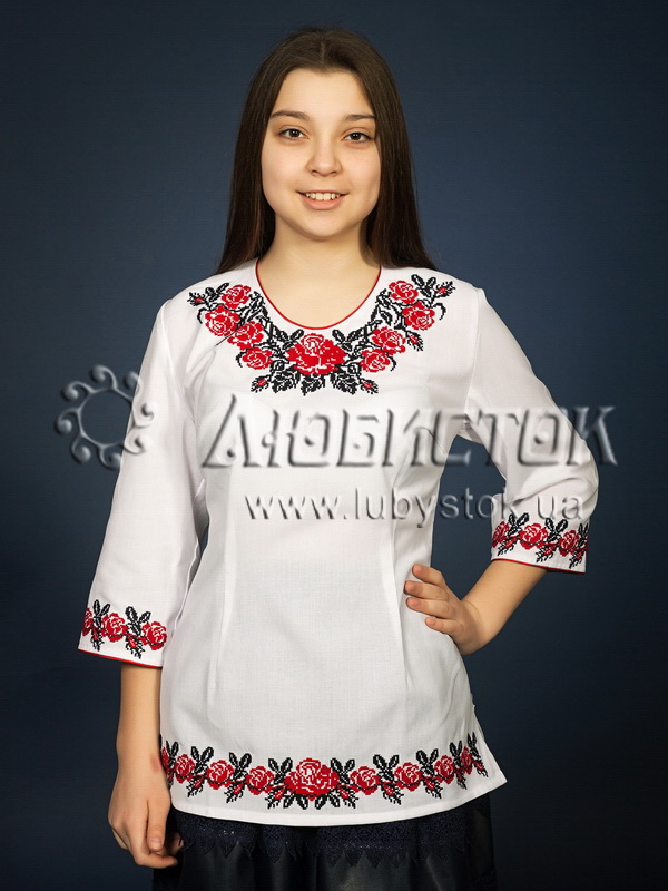 Вишита блуза хрестиком (вишита жіноча сорочка) ЖБВ 7-1. Ця блузка має елегантний вигляд, вишиті троянди надають їй оригінальності. Стиль сорочки сучасний з традиційними мотивами на білій домотканій тканині або натуральному льоні. Вишивка виконана рослинним візерунком у вигляді троянд з листочками. Вишиванка вишита хрестиком червоними та чорними акриловими нитками. Рукав три четверті. Ця блузка підійде для святкування різноманітних свят, одягнувши її ваш настрій неоднмінно стане святковішим.
