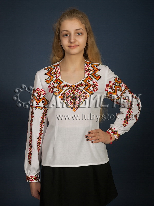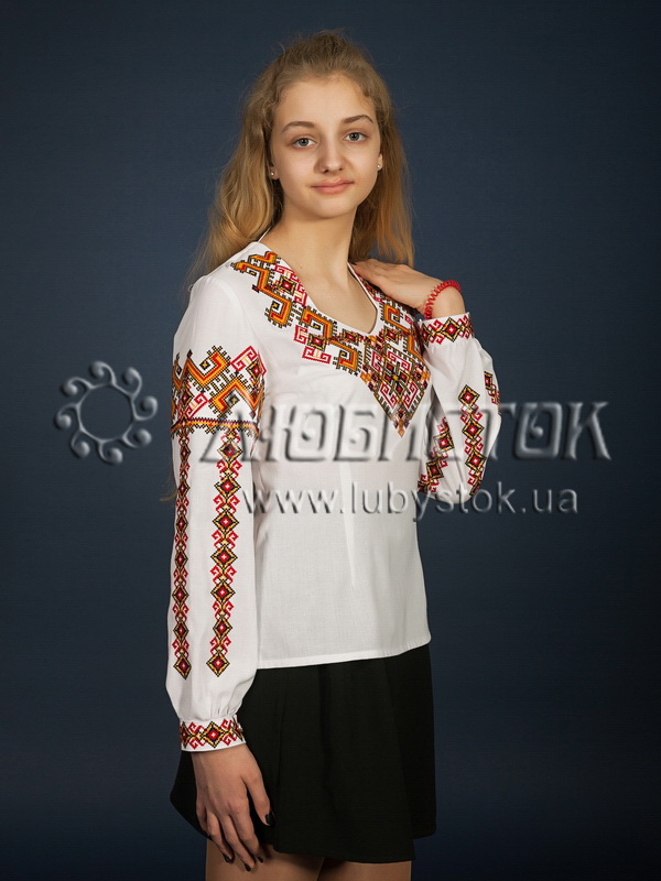 Вишиванка хрестиком - вишита жіноча сорочка ЖБВ 8-1. Блузка має класично-традиційний вигляд, пасує як для молодих так і для старших за віком жінок. Пошита з білої домотканої тканини або натурального льону. Вишивка виконана геометричним візерунком, розміщена на грудях, рукавах та манжетах блузки. Вишиванка вишита хрестиком червоними, жовтими та чорними акриловими нитками. Рукав довгий, оригінальний виріз. Цю блузку можна одягнути як для святкування різноманітних подій так і в будний день, а ще вона чудово підійде для подарунка.