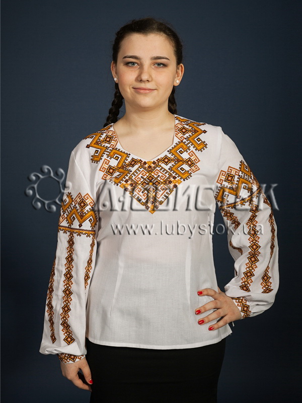Вишиванка хрестиком - вишита жіноча сорочка ЖБВ 8-3. Блузка має класично-традиційний вигляд, пасує як для молодих так і для старших за віком жінок. Пошита з білої домотканої тканини або натурального льону. Вишивка виконана геометричним візерунком, розміщена на грудях, рукавах та манжетах блузки. Вишиванка вишита хрестиком червоними, гірчичними, беживими та коричневими акриловими нитками. Рукав довгий, оригінальний виріз. Цю блузку можна одягнути як для святкування різноманітних подій так і в будний день, а ще вона чудово підійде для подарунка.