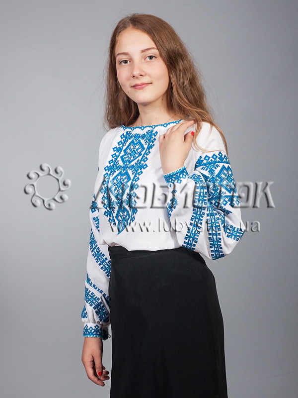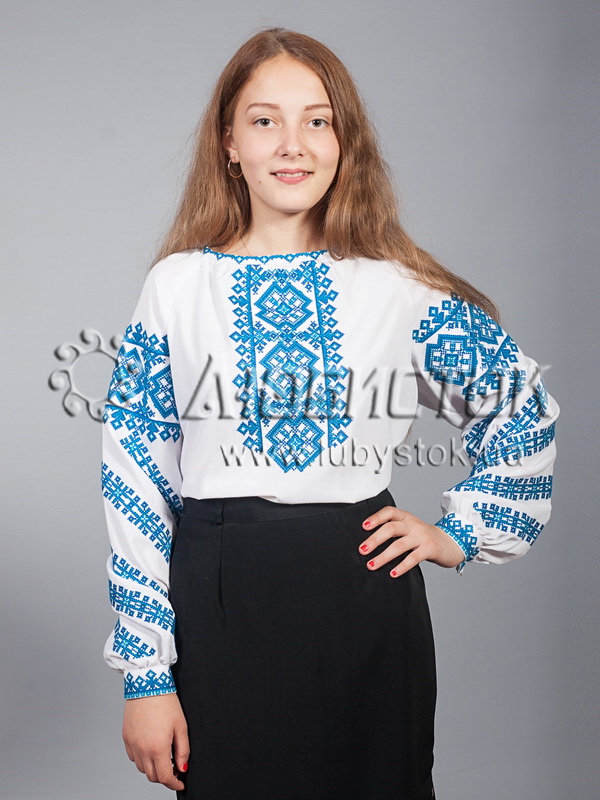 Вишиванка хрестиком - вишита жіноча сорочка ЖБВ 9-2. Блузка має класично традиційний вигляд, пасує як для молодих так і для старших за віком жінок. Пошита з білої домотканої тканини або натурального льону. Вишивка виконана геометричним візерунком, розміщена на грудях, рукавах та манжетах блузки. Вишита хрестиком бірюзовими та блакитними акриловими нитками. Цю блузку можна одягнути для святкування різноманітних подій, а ще вона чудово підійде на подарунок.