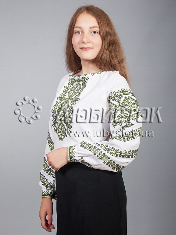Жіноча вишиванка хрестиком ЖБВ 9-3. Блузка має класично традиційний вигляд, пасує як для молодих так і для старших за віком жінок. Пошита з білої домотканої тканини або натурального льону. Вишивка виконана геометричним візерунком, розміщена на грудях, рукавах та манжетах блузки. Вишиванка вишита хрестиком темно зеленими та зеленими акриловими нитками. Цю блузку можна одягнути як для святкування різноманітних подій так і в будний день, а ще вона чудово підійде для подарунка.