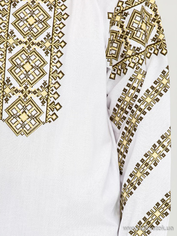 Вишиванка хрестиком - вишита жіноча сорочка ЖБВ 9-6. Блузка має класично традиційний вигляд, пасує як для молодих так і для старших за віком жінок. Пошита з білої домотканої тканини або натурального льону. Вишивка виконана геометричним візерунком, розміщена на грудях, рукавах та манжетах блузки. Вишиванка вишита хрестиком коричневими, темно зеленими та бежевими акриловими нитками. Цю блузку можна одягнути як для святкування різноманітних подій так і в будний день, а ще вона чудово підійде на подарунок.