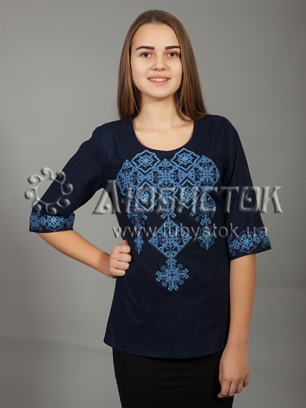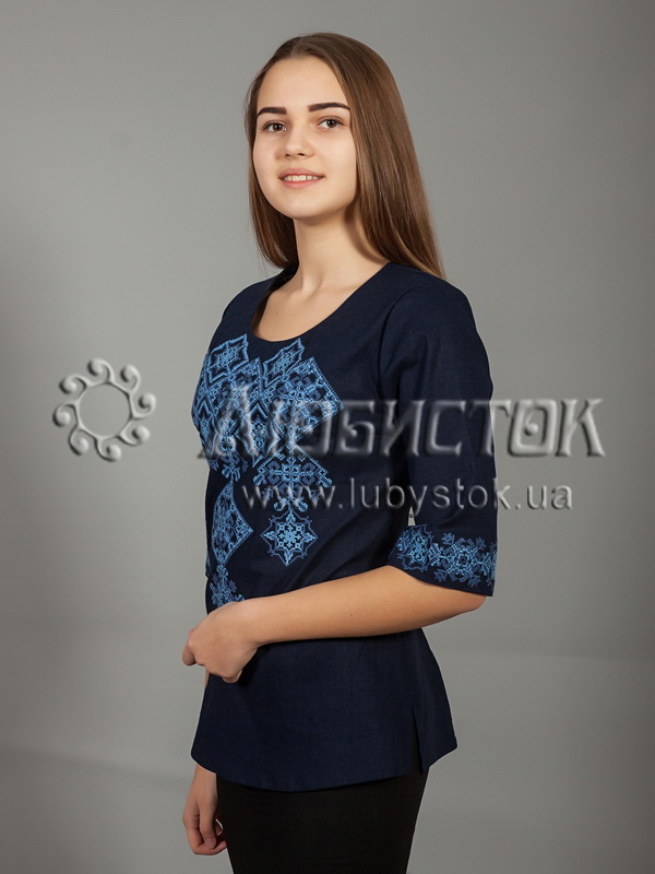 Вишиванка хрестиком - вишита жіноча сорочка ЖБВ 10-1. Ця блузка виглядає елегантно та оригінально. Стиль сорочки сучасний з темно синього натурального льону. Вишиванка вишита хрестиком темно синіми, синіми та блакитними акриловими нитками. Вишивка виконана геометричним візерунком, розміщена на грудях та рукавах блузки. Рукав три чверті. Ця сорочка підійде як для святкових так і для будних днів, надасть вам стильного вигляду.