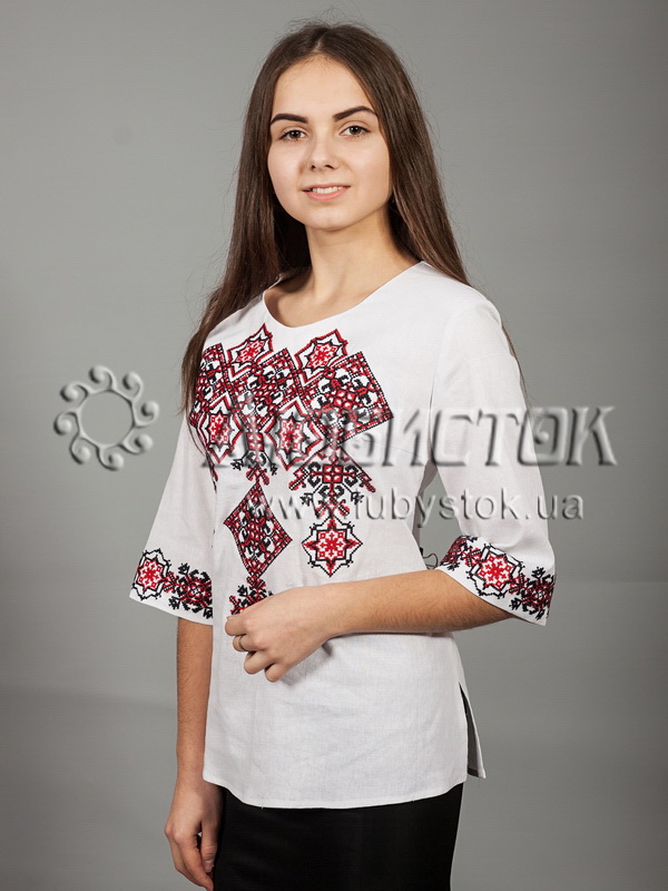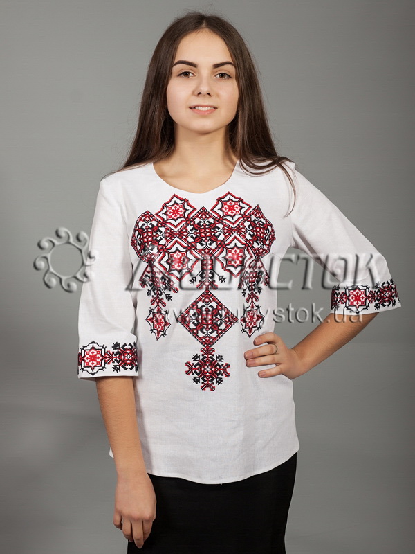 Вишиванка хрестиком - вишита жіноча сорочка ЖБВ 10-3. Завдяки багатому орнаменту ця блузка має святковий вигляд. Стиль сучасний з традиційними мотивами на білій домотканій тканині або натуральному льоні. Вишиванка вишита хрестиком червоними та чорними акриловими нитками, виконана геометричним візерунком. Вишивка розміщена на грудях та рукавах блузки. Рукав три четверті. Ця сорочка підійде для урочистих та святкових подій.