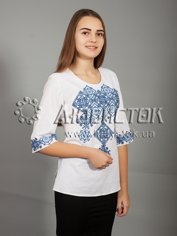 Вишиванка хрестиком - вишита жіноча сорочка ЖБВ 10-4. Завдяки кольорам ця блузка має ніжний та витриманий вигляд. Стиль сучасний з традиційними мотивами на білій домотканій тканині або натуральному льоні. Вишиванка вишита хрестиком темно синіми, синіми та блакитними акриловими нитками, виконана геометричним візерунком. Вишивка розміщена на грудях та рукавах блузки. Рукав три четверті. Ця сорочка підійде як для святкових так і для будних днів.