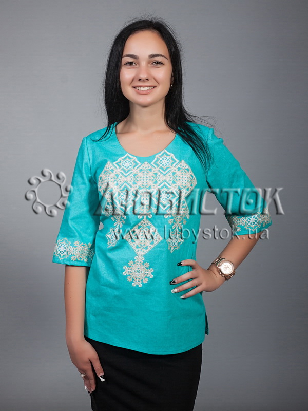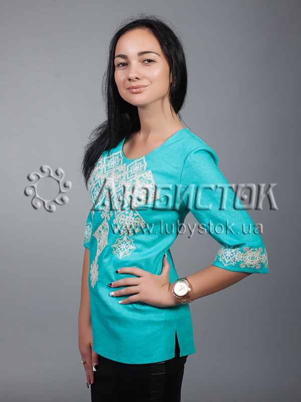 Вишиванка хрестиком - вишита жіноча сорочка ЖБВ 10-7. Завдяки кольору тканини ця блузка має яскравий вигляд. Стиль сучасний з традиційними мотивами на бірюзовій тканині з натурального льону. Вишиванка вишита хрестиком білими акриловими нитками, виконана геометричним візерунком. Вишивка розміщена на грудях та рукавах блузки. Рукав три четверті. Ця сорочка підійде як для святкових так і для днів коли хочеться мати яскравий вигляд.