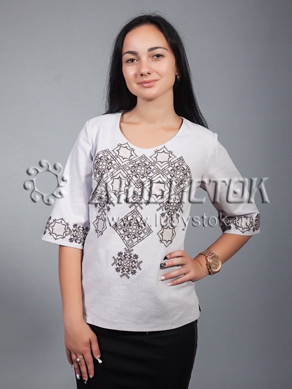 Вишиванка хрестиком - вишита жіноча сорочка ЖБВ 10-9. Завдяки кольорам ця блузка має ніжний та витриманий вигляд. Стиль сучасний з традиційними мотивами на білій домотканій тканині або натуральному льоні. Вишиванка вишита хрестиком коричневими, сірими та бежевими акриловими нитками, виконана геометричним візерунком. Вишивка розміщена на грудях та рукавах блузки. Рукав три четверті. Ця сорочка підійде як для святкових так і для будних днів.