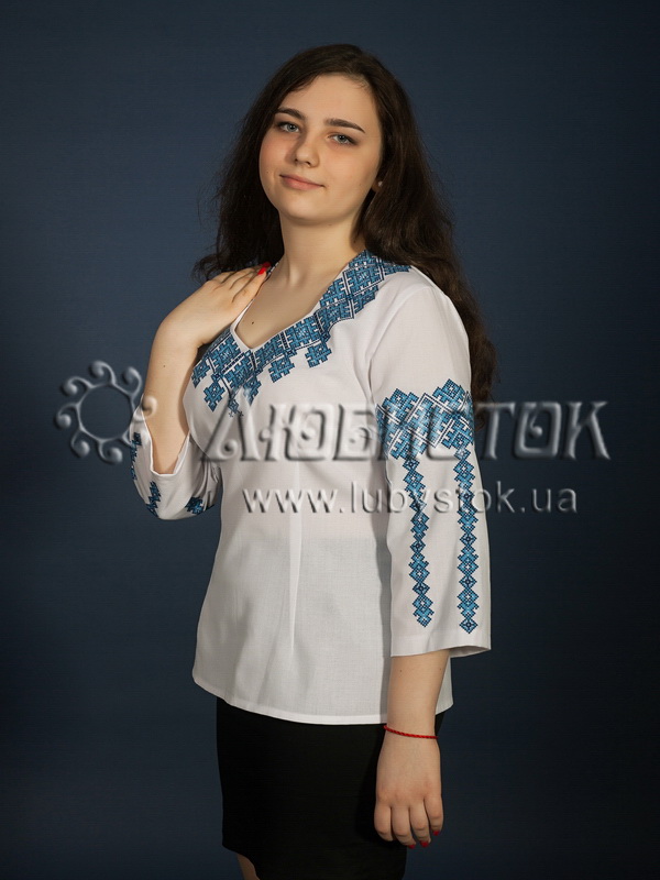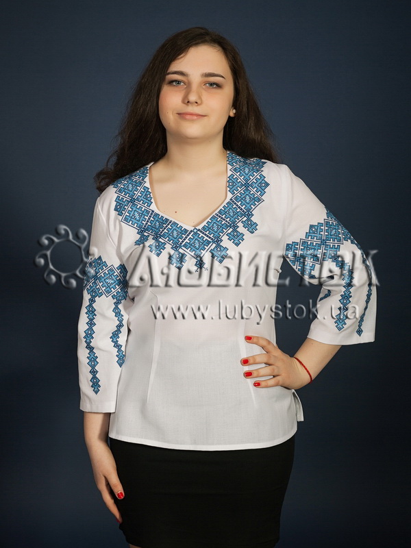 Вишиванка хрестиком - вишита жіноча сорочка ЖБВ 12-3. Завдяки кольорам ця блузка має ніжний та витриманий вигляд. Стиль сучасний з традиційними мотивами на білій домотканій тканині або натуральному льоні. Вишиванка вишита хрестиком синіми та чорними акриловими нитками, виконана геометричним візерунком. Вишивка розміщена на грудях та рукавах блузки. Рукав три четверті. Ця сорочка підійде як для святкових так і для будних днів.