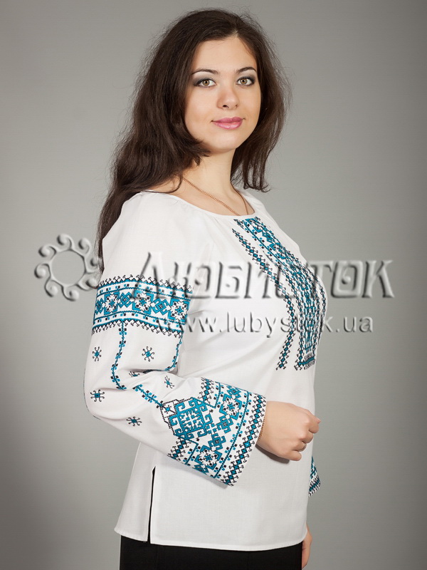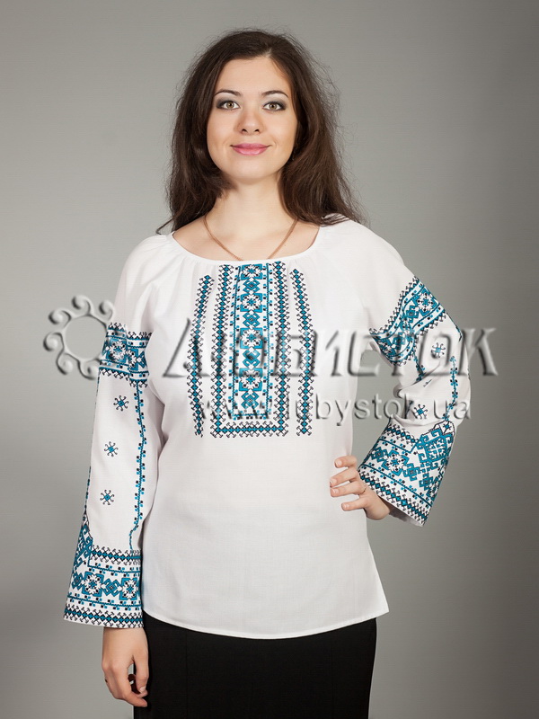 Вишиванка хрестиком - вишита жіноча сорочка ЖБВ 16-3. Завдяки фасону та орнаменту має стильний та оригінальний вигляд. Стиль сорочки сучасний з традиційними мотивами на білій домотканій тканині або натуральному льоні. Вишивка виконана геометричним візеруноком, розміщена на грудях, рукавах та манжетах блузки. Рукав довгий. Вишиванка вишита хрестиком синіми, бірюзовими та сірими акриловими нитками. Підійде для святкувань особливих подій та надасть вам надзвичайного вигляду.