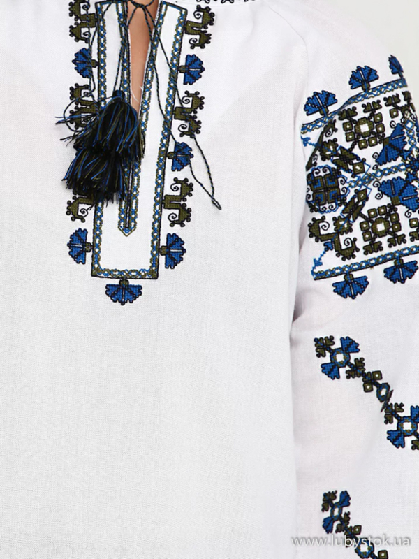 Вишиванка хрестиком - вишита жіноча сорочка ЖБВ 18-5. Особливий орнамент та підібрані кольори надають цій блузці оригінального виляду. Стиль сорочки сучасний з традиційними мотивами на білій домотканій тканині або натуральному льоні. Вишиванка вишита хрестиком синіми, темно зеленими та чорними акриловими нитками. Візерунок вишивки геометричний. Вишивка розміщена на грудях, рукавах та манжетах блузки. Рукав довгий. Ця сорочка підійде як для святкових так і для днів коли хочеться виглядати особливою.