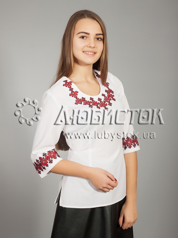 Жіноча вишиванка хрестиком ЖБВ 21-1. Вигляд цієї блузки ніжний та витриманий. Стиль сучасний з традиційними мотивами на білій домотканій тканині або натуральному льоні. Вишивка виконана геометричним візеруноком, розміщена на грудях та рукавах блузки. Вишита хрестиком чорними, та червоними акриловими нитками. Рукав три четверті. Цю блузку можна одягнути як в святкові так і в будні дні, надавши при цьому собі особливого вигляду. Чудово підійде на подарунок близькій людині.