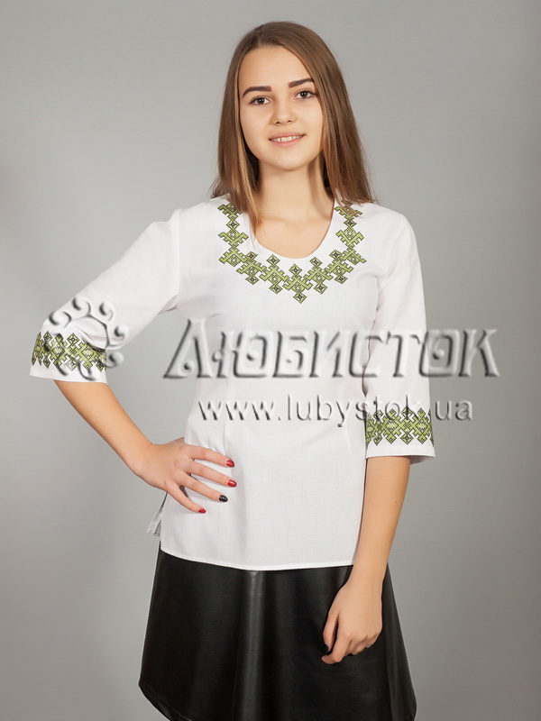 Жіноча вишиванка хрестиком ЖБВ 21-2 . Вигляд цієї блузки ніжний та витриманий. Стиль сорочки сучасний на білій домотканій тканині або натуральному льоні. Вишиванка вишита хрестиком зеленими та темно зеленими акриловими нитками. Виконана геометричним візерунком, розміщена на грудях та рукавах блузки. Рукав три четверті. Сорочка нарядна, святкова - підійде для різних подій.