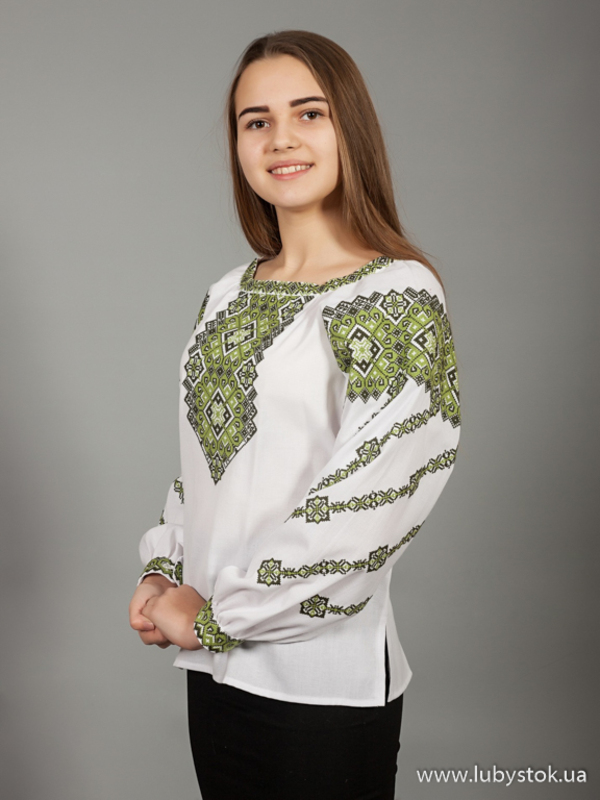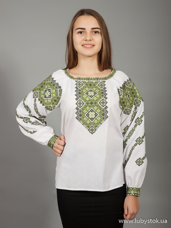 Вишиванка хрестиком - вишита жіноча сорочка ЖБВ 23-3. Ця блузка має класичний вигляд. Стиль сорочки традиційний на білій домотканій тканині або натуральному льоні. Вишиванка вишита хрестиком темно зеленими, зеленими та чорними акриловими нитками, виконана геометричним візерунком. Розміщена на грудях, рукавах та манжетах блузки. Рукав довгий. Оригінальний вигляд сорочки підійде для національних свят та урочистих подій.