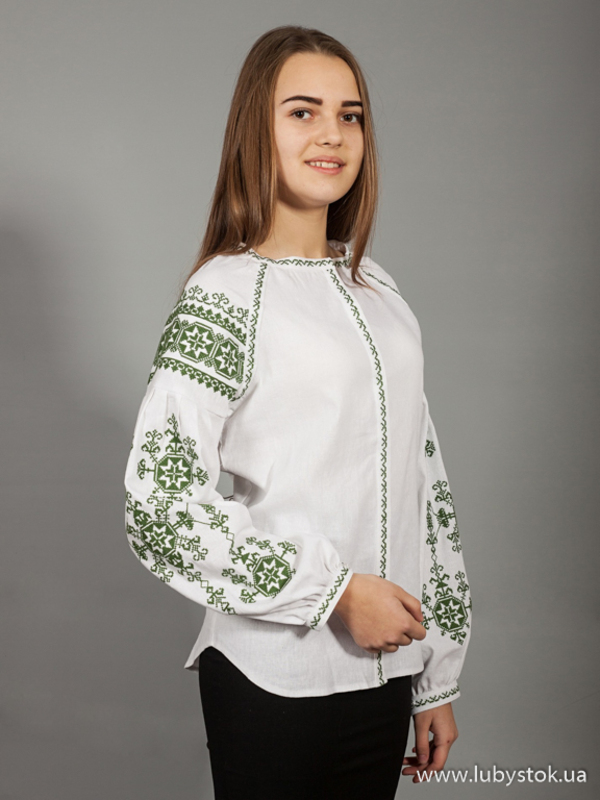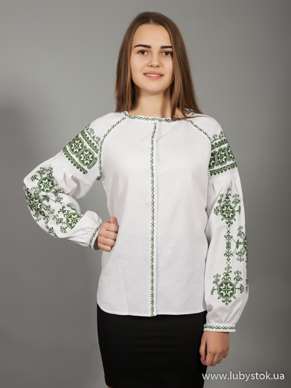 Вишиванка хрестиком - вишита жіноча сорочка ЖБВ 24-4. Ця блузка виглядає елегантно та святково. Стиль сорочки сучасний з білого натурального льону або домотканої тканини. Вишиванка вишита хрестиком зеленими акриловими нитками. Вишивка виконана геометричним візерунком, розміщена на грудях, рукавах та манжетах блузки. Рукав довгий. Ця сорочка підійде як для святкових подій так і для днів коли хочеться гарно виглядати, надасть вам елегантного та особливого вигляду.