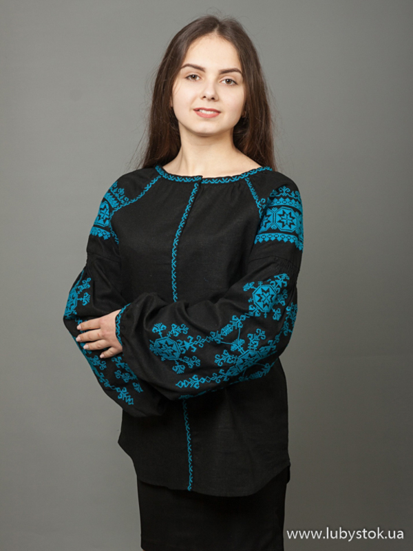Вишиванка хрестиком - вишита жіноча сорочка ЖБВ 24-8. Ця блузка виглядає елегантно та стримано. Стиль сорочки сучасний на тканині чорного кольору з натурального льону. Вишиванка вишита хрестиком яскраво синіми акриловими нитками. Вишивка виконана геометричним візерунком, розміщена на грудях, рукавах та манжетах блузки. Рукав довгий. Ця сорочка підійде для урочистих подій, надасть вам елегантного та особливого вигляду.