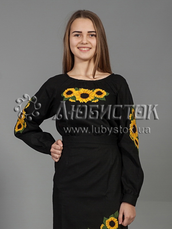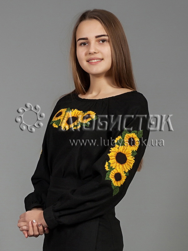 Вишиванка хрестиком - вишита жіноча сорочка ЖБВ 27-1. Ця блузка завдяки кольору тканини та візирунку виглядає елегантно і вишуконо. Стиль сорочки сучасний на тканині чорного кольору з натурального льону. Вишиванка вишита хрестиком жовтими, зеленими та темно коричнивими акриловими нитками. Вишивка виконана рослинним візерунком у вигляді соняшника. Розміщена на грудях та рукавах блузки. Рукав довгий. Чудово підійде для святкових подій, надасть вам елегантного та особливого вигляду.