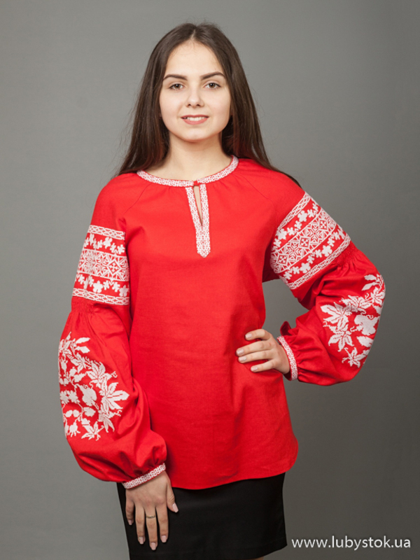 Вишиванка хрестиком - вишита жіноча сорочка ЖБВ 28-2. Завдяки фасону та кольору блуза виглядає дуже оригінальною. Стиль сучасний з традиційними мотивами на червоному натуральному льоні. Вишиванка вишита хрестиком білими акриловими нитками. Виконана рослинно-геометричним візеруноком. Чудово підійде як для святкових так і для днів коли хочеться виглядати по особливому.