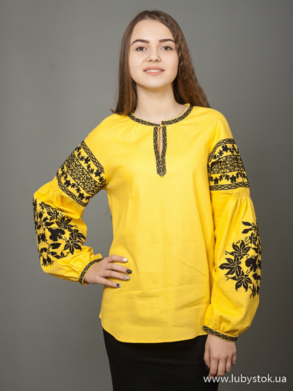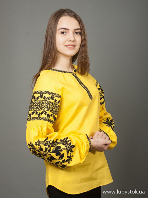 Вишиванка хрестиком для дівчинки - вишита жіноча сорочка ЖБВ 28-4. Завдяки фасону та кольору блуза виглядає дуже оригінальною. Стиль сучасний з традиційними мотивами на жовтому натуральному льоні. Вишиванка вишита хрестиком чорними акриловими нитками. Виконана рослинно-геометричним візеруноком. Чудово підійде як для святкових так і для днів коли хочеться виглядати по особливому.