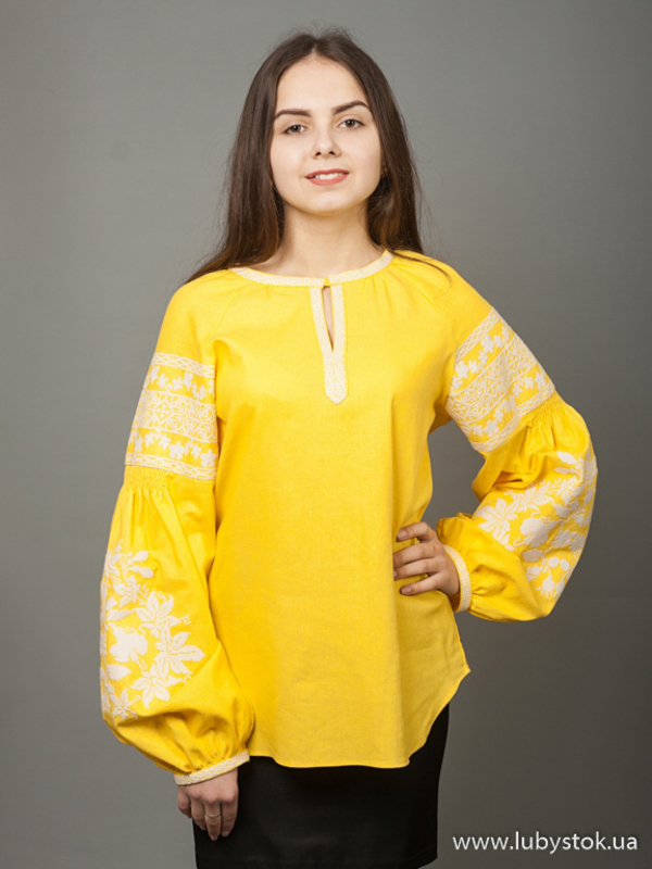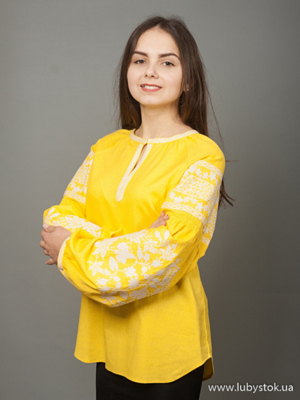 Вишиванка хрестиком - вишита жіноча сорочка ЖБВ 28-5. Завдяки фасону та кольору блуза виглядає дуже оригінальною. Стиль сучасний з традиційними мотивами на жовтому натуральному льоні. Вишиванка вишита хрестиком білими акриловими нитками. Виконана рослинно-геометричним візеруноком. Чудово підійде як для святкових так і для днів коли хочеться виглядати по особливому.