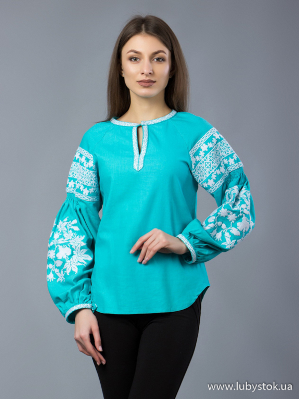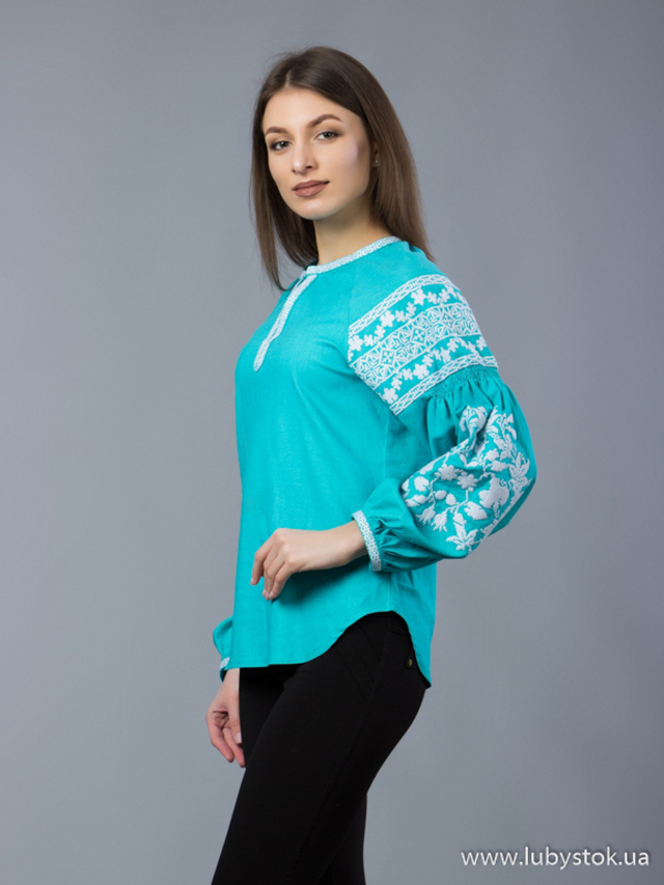 Вишиванка хрестиком - вишита жіноча сорочка ЖБВ 28-6. Завдяки фасону та кольору блуза виглядає дуже оригінальною. Стиль сучасний з традиційними мотивами на бірюзовому натуральному льоні. Вишиванка вишита хрестиком білими акриловими нитками. Виконана рослинно-геометричним візеруноком. Чудово підійде як для святкових так і для днів коли хочеться виглядати по особливому.
