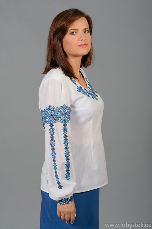 Вишиванка хрестиком - вишита жіноча сорочка ЖБВ 32-1. Вигляд цієї блузки ніжний та витриманий. Стиль сорочки сучасний на білій домотканій тканині або натуральному льоні. Вишиванка вишита хрестиком блакитними та чорними акриловими нитками. Виконана геометричним візерунком, розміщена на грудях та рукавах блузки. Рукав довгий. Сорочка нарядна, святкова - підійде для різних подій.