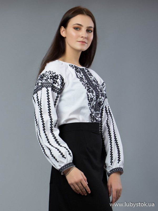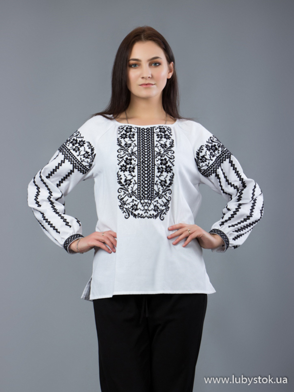 Вишиванка хрестиком - вишита жіноча сорочка ЖБВ 36-1. Гарна блуза в сучасному стилі на білій домотканій тканині або натуральному льоні. Вишиванка вишита хрестиком чорними акриловими нитками. Виконана рослинно-геометричним візерунком, який розміщений на грудях та рукавах блузки. Рукав довгий. Сорочка нарядна, святкова - підійде для різних подій.