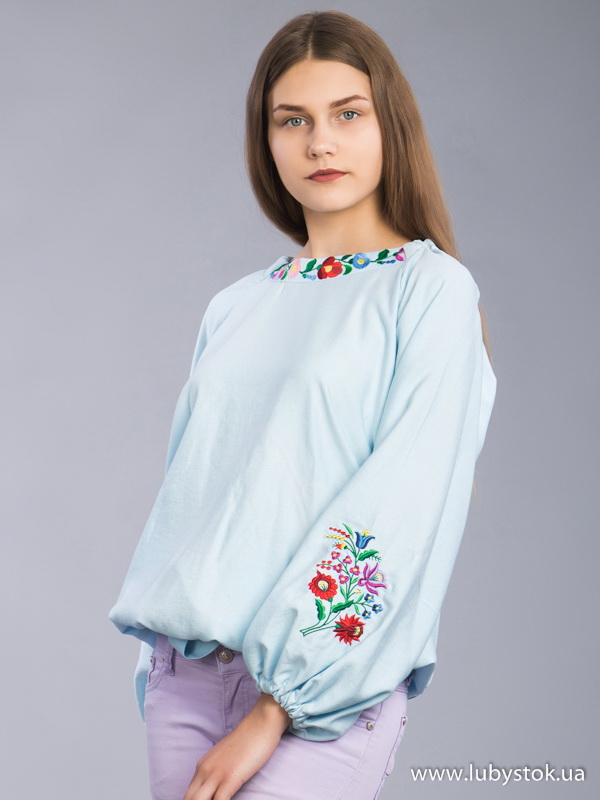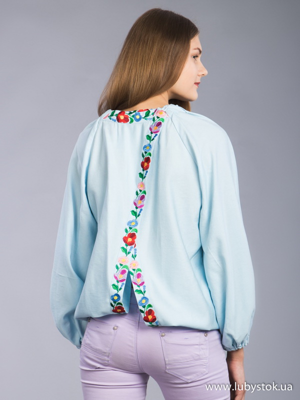 Жіноча вишиванка гладдю ЖБВ 38-1. Ця блузка має дуже ніжний та оригінальний вигляд. Стиль сорочки сучасний з традиційними мотивами на блакитному натуральному льоні. Вишиванка вишита гладдю зеленими, червоними, блакитними, жовтими та бірюзовими віскозними нитками. Візерунок вишивки рослинний у вигляді колорових квітів. Вишивка розміщена на грудях, рукавах та озаду блузки, що додає оригінальності. Рукав довгий. Цю сорочку можна одягати на будь-які події і ваш день буде особливим.
