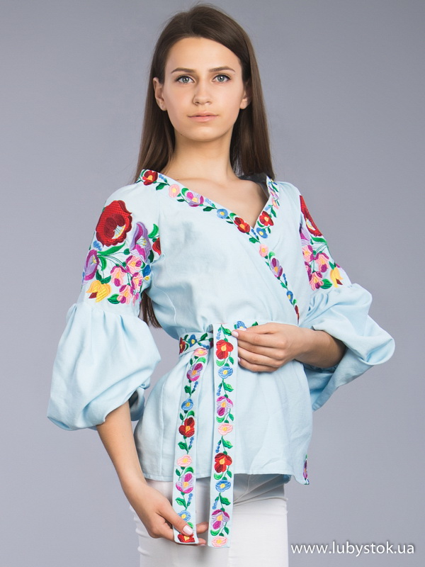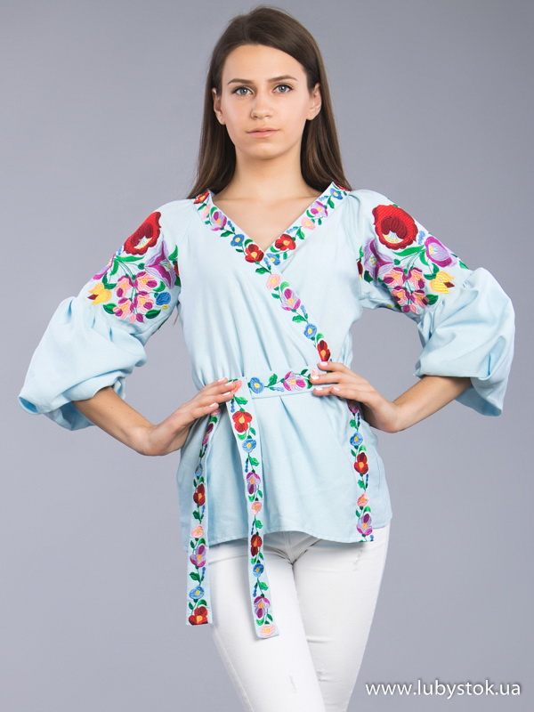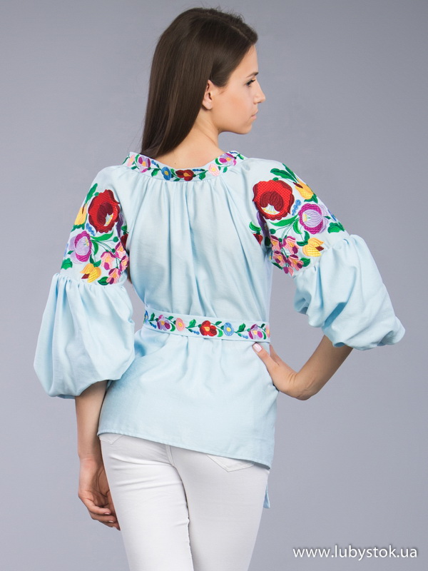 Жіноча вишиванка гладдю ЖБВ 40-1 з вишитим квітами поясом. Ця блузка має дуже ніжний та оригінальний вигляд. Стиль сорочки сучасний з традиційними мотивами на ніжному блакитному натуральному льоні. Вишиванка вишита гладдю зеленими, червоними, блакитними, жовтими та бірюзовими віскозними нитками. Візерунок вишивки рослинний у вигляді колорових квітів. Вишивка розміщена на грудях та рукавах рукавах. Рукав довгий. Цю сорочку можна одягати на будь-які події і ваш день буде особливим.