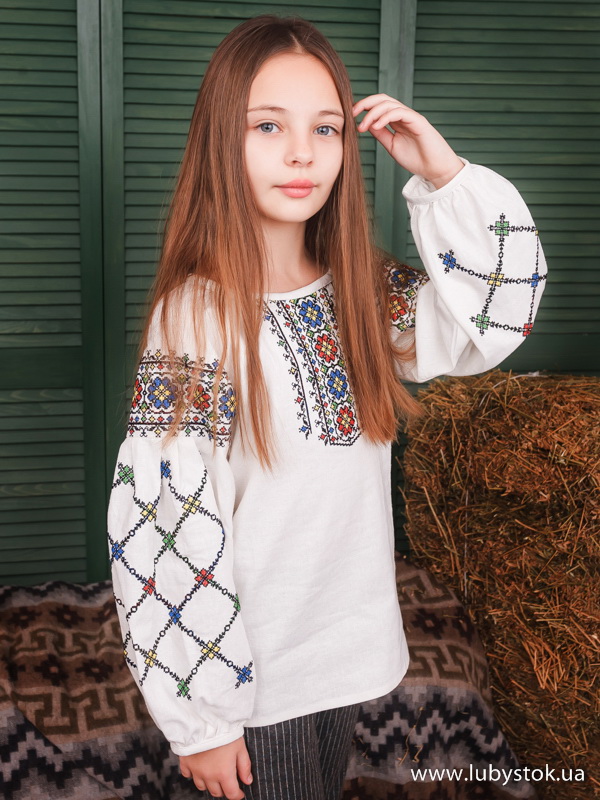 Вишиванка хрестиком для дівчинки - вишита жіноча сорочка ЖБВ 55-1Д. Особливий орнамент та підібрані кольори надають цій блузці оригінального виляду. Стиль сорочки сучасний з традиційними мотивами на натуральному льоні бежевого кольору. Вишиванка вишита хрестиком червоними, синіми, зеленими, жовтими та чорними акриловими нитками. Візерунок вишивки рослинно-геометричний. Вишивка розміщена на грудях та рукавах блузки. Рукав довгий. Ця сорочка підійде як для святкових так і для днів коли хочеться виглядати особливою.